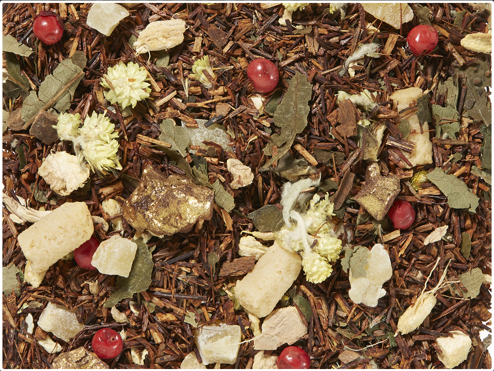 Состав: рооибос, парчиња ѓумбир, коцкички ѓумбир, златни шеќерни грутки, парчиња марципан, листови од капина, парчиња цимет, цветови од Antennaria dioica, црвен бибер, арома